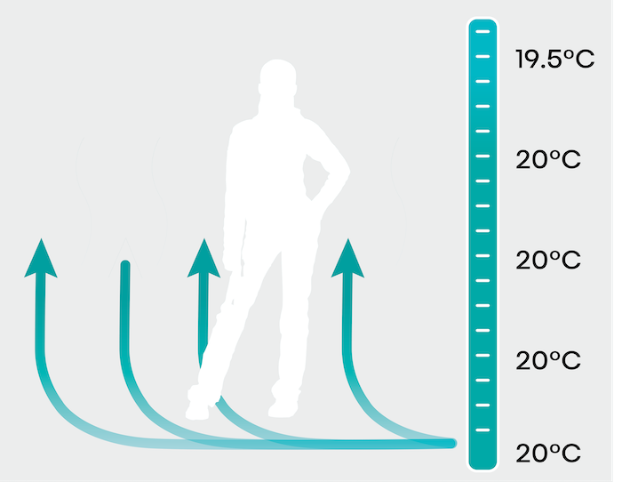 Teplý vzduch je nasmerovaný tam, kde ho najviac potrebujete – smerom k podlahe, čo zabezpečuje účinné a rýchle vykúrenie priestoru.