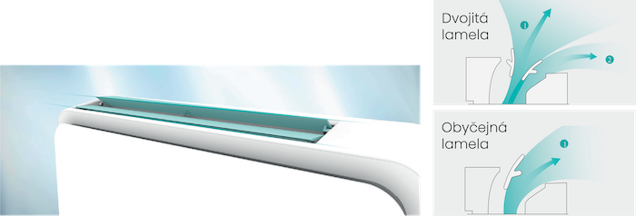 Inovatívna dvojitá lamela sa pri vypnutí jednotky úplne uzavrie a pri zapnutí sa samostatne otáča, čo umožňuje presnejšie riadenie prúdenia vzduchu.